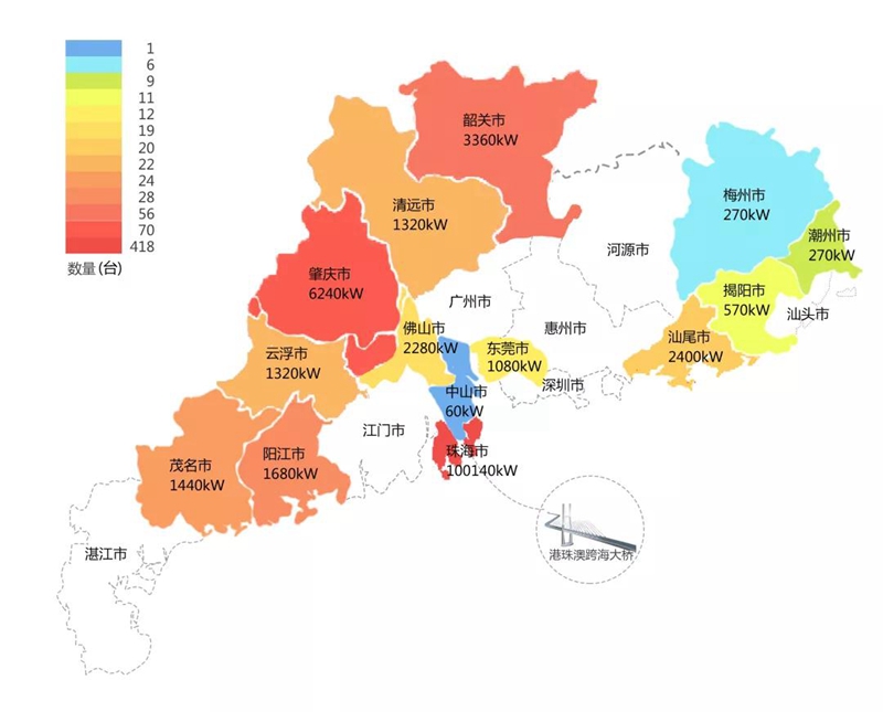 2018年,在港珠澳大桥充电桩项目中,北京极速定位科技有限公司在港珠澳大桥珠海端口岸人工岛搭建的充电管理平台及电能量采集终端,为大桥的绿色运营和电力保障提供技术支持。除此之外,仅广东省内,北京极速定位科技有限公司充电桩涵盖肇庆、珠海等14个城市,具体分布情况如下图所示。